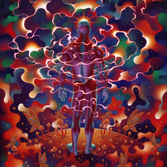 I really resonate with Alex Grey. The immense power of psychedelics that have revealed so much of my inner workings of my psyche is something that he has portrayed beautifully for decades. What I also resonated with him, and was inspired by him, but took it into a new direction, is his focus on the human anatomy. While he depicts an x-ray version of human anatomy, with muscles and veins, I use the human anatomy models as a way of transcending race, to make my art about the universal experience of being a human. It was something I was struggling to achieve. I am an Eastern European male with dark features, and my art inevitably was inspired by me, and I often used myself as a subject of my own art. But despite my art being a visual journal of my personal human experience, I wanted my art to transcend me as an individual that looks a certain way. And I remember looking at Alex Grey’s art and thinking, I really enjoy the simplification of features where the rendered subject would allow the viewer to imagine themselves in the piece easier. So that was a big part of my inspiration, but that is really mainly it, as least that I am aware of.