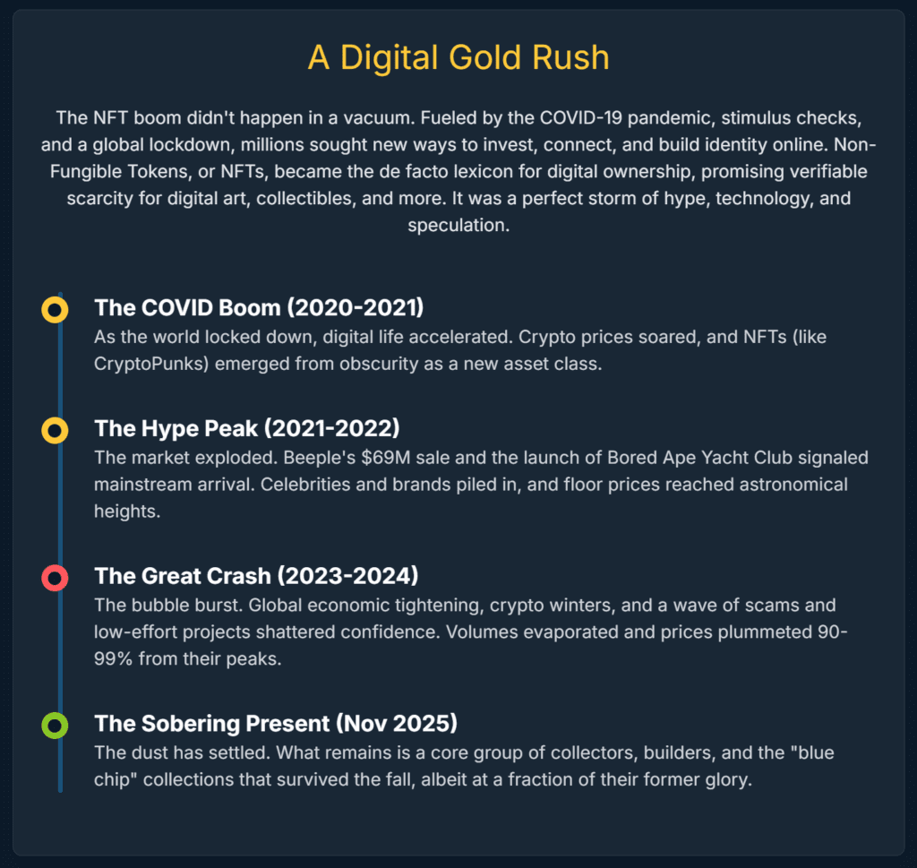 - The Consolidation & Rebirth: An analysis of the current November 2025 market, which reveals a “flight to quality” and the emergence of a new, sustainable model based on real-world utility, intellectual property, and verifiable access—a future where the technology is “inevitable,” even as the toxic “NFT” branding is abandoned.